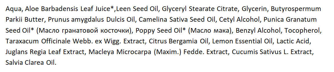 Несмотря на достаточно обширный состав, вопросов к нему нет. Вода, сок алоэ, льняное масло, глицерил стеарат – это эмульгатор растительного происхождения. Дальше море масел – ши, миндальное, рыжика, гранатовой косточки, мака. Экстракты – одуванчика, грецкого ореха, огурца, маклейи. В общем – состав такой, что можно ложкой есть. Шутка, конечно 🙂