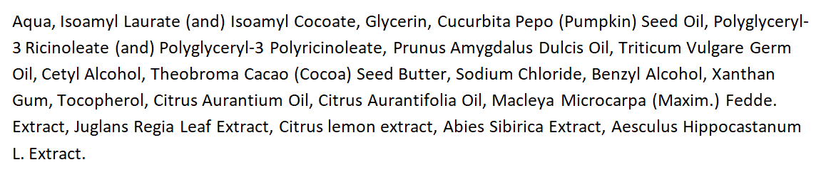 Активными компонентами тут вновь стали масла – тыквы, миндаля, какао, нероли. Есть также экстракты – пихты, каштана, лимона.